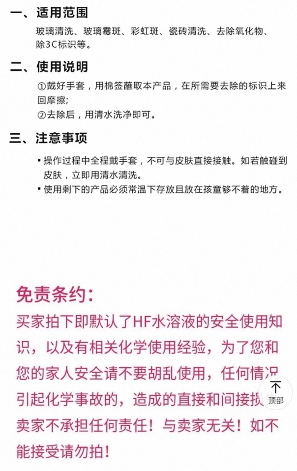 而在商品頁(yè)面上,不少商家提及其功能,寫(xiě)有“清洗玻璃霉斑、彩虹斑、去除玻璃3C標志性、圖案、蝕刻玻璃,瓷器陶瓷、石頭作舊、酸洗金屬,去除表面氧化物”等宣傳語(yǔ),但在頁(yè)面內介紹產(chǎn)品時(shí)卻僅說(shuō)明“戴好手套、棉簽蘸??;不可與皮膚直接接觸,如若接觸到皮膚,立即用清水清洗?!钡⑽刺峒耙谕L(fēng)、戴安全面罩的情況下使用,也并未提及剩余試劑的保存問(wèn)題;同時(shí)注明免責條約“買(mǎi)家拍下即默認使用常識和化學(xué)使用經(jīng)驗”等內容。
