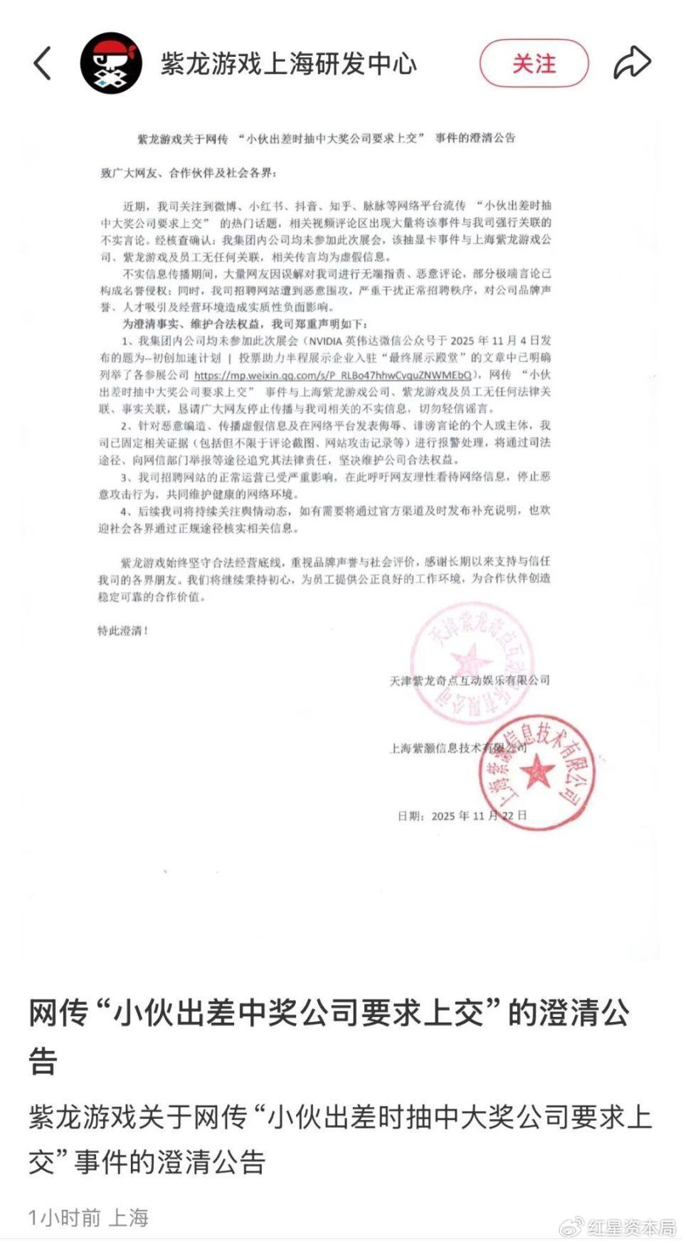1、我集團內公司均未參加此次展會(huì )(NVIDIA英偉達微信公眾號于2025年11月4日發(fā)布的題為一初創(chuàng )加速計劃|投票助力半程展示企業(yè)入駐“最終展示殿堂”的文章中已明確列舉了各參展公司 https://mp.weixin.qq.com/s/P RLBo47hhwCvquZNWMEbQ),網(wǎng)傳“小伙出差時(shí)抽中大獎公司要求上交”事件與上海紫龍游戲公司、紫龍游戲及員工無(wú)任何法律關(guān)聯(lián)、事實(shí)關(guān)聯(lián),懇請廣大網(wǎng)友停止傳播與我司相關(guān)的不實(shí)信息,切勿輕信謠言。