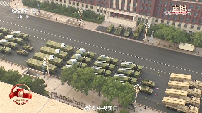 閱兵裝備方隊原地熱車(chē)啟動(dòng)!從閱兵直播的高處視角中,幾乎可以看到全部的徒步方隊、戰旗方隊以及裝備方隊。廣場(chǎng)、紅旗、人群、裝備、建筑,目之所及的每一個(gè)元素相互交融,彰顯著(zhù)紀律與力量,展現著(zhù)“不怒自威” 的