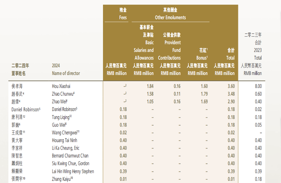 據財報披露,趙春武2024年的總薪酬,大概為340多萬(wàn)元,其中,薪金及津貼約158萬(wàn)元、住房公積金及社保約11萬(wàn)元及花紅約179萬(wàn)元,與侯孝海大體相當。