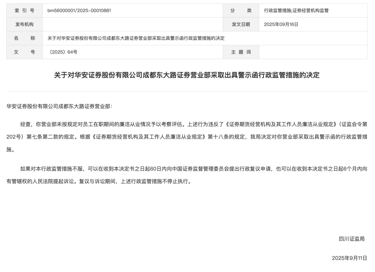 基于上述事實(shí),違規華安證券營(yíng)業(yè)部人員田柯被監管采取責令改正的券商行政監管措施,營(yíng)業(yè)部則被采取出具警示函的員工行政監管措施。