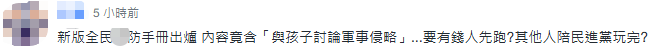 值得注意的是,該手冊?xún)热莞w“如何與孩子討論危機與軍事侵略”,引發(fā)島內輿論強烈質(zhì)疑和譴責。不少臺灣網(wǎng)友痛斥民進(jìn)黨當局制造恐慌連小孩子都不放過(guò)。