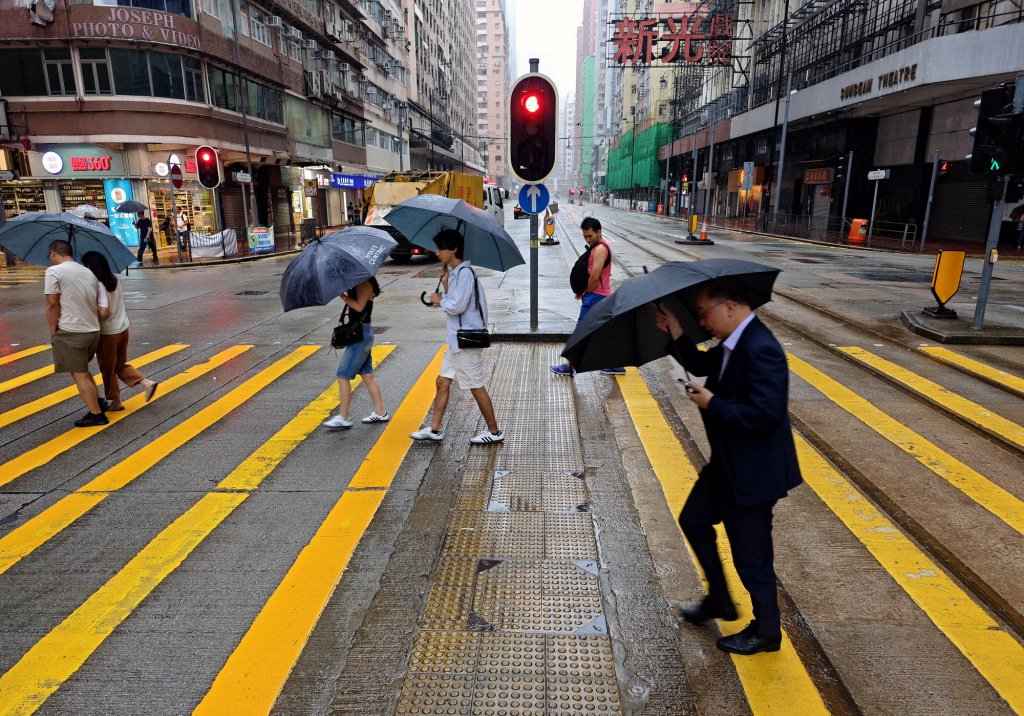 9月8日,受臺風(fēng)“塔巴”影響,香港遭遇較強風(fēng)雨,市民冒著(zhù)風(fēng)雨在香港街頭出行。
