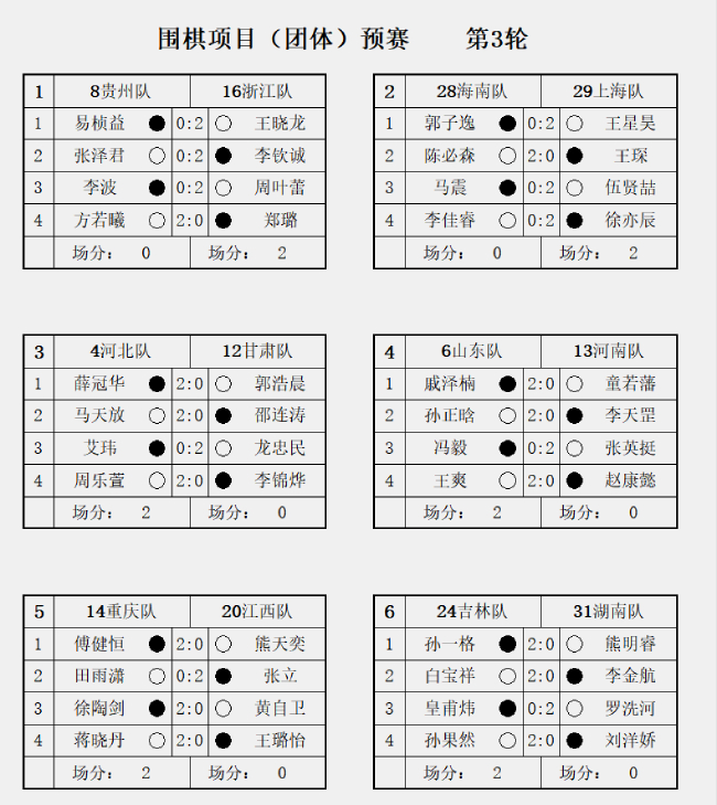 9月13日下午,中華人民共和國第十五屆運動(dòng)會(huì )群眾比賽圍棋項目(團體)預賽第3輪比賽在浙江衢州大花園國際酒店戰罷。賽第上海焦點(diǎn)戰王星昊勝郭子逸,江勝助上海隊勝海南隊,貴州浙江隊勝貴州隊,第輪三輪過(guò)后上海隊與浙江隊場(chǎng)分同積6分領(lǐng)跑。浙江