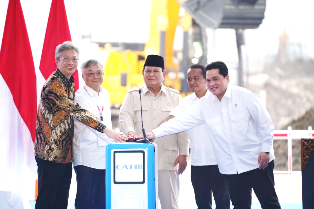 印尼總統普拉博沃·蘇比延多(中)出席一個(gè)中企與當地企業(yè)共同投資建設的印尼鎳資源和電池產(chǎn)業(yè)鏈項目。