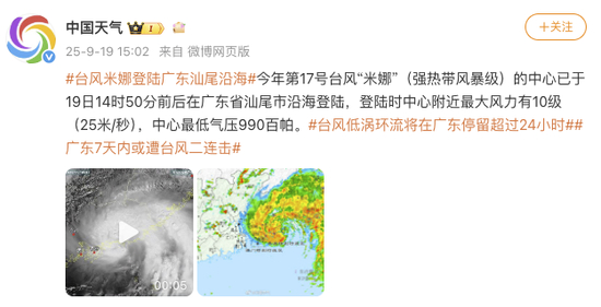 今年第17號臺風(fēng)“米娜”(強熱帶風(fēng)暴級)的米娜中心已于9月19日14時(shí)50分前后在廣東省汕尾市沿海登陸,登陸時(shí)中心附近最大風(fēng)力有10級(25米/秒),臺風(fēng)中心最低氣壓990百帕。登陸(中國天氣)