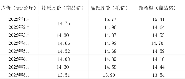 三大上市豬企銷(xiāo)售均價(jià)情況。制表 澎湃新聞