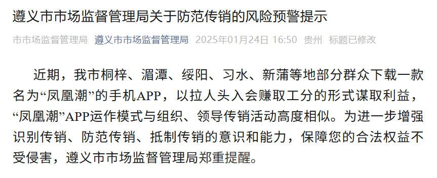 遵義市市場(chǎng)監督管理局年初發(fā)布的風(fēng)險提示稱(chēng),近期,我市桐梓、湄潭、綏陽(yáng)、習水、新蒲等地部分群眾下載一款名為“鳳凰潮”的手機APP,以拉人頭入會(huì )賺取工分的形式謀取利益,“鳳凰潮”APP運作模式與組織、領(lǐng)導傳銷(xiāo)活動(dòng)高度相似。
