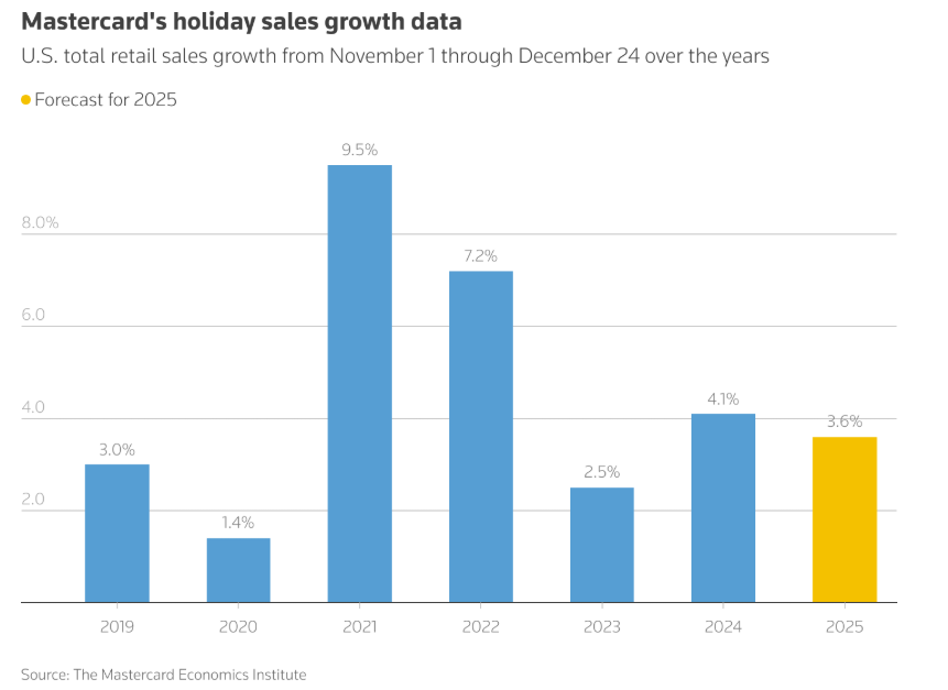 根據萬(wàn)事達卡的美國報告,今年美國假日季的線(xiàn)上銷(xiāo)售額預計將同比增長(cháng)7.9%,而去年的增長(cháng)率為8.6%。而店內銷(xiāo)售額預計會(huì )同比增長(cháng)2.3%。在2024年的假日季,這一數字為2.8%。