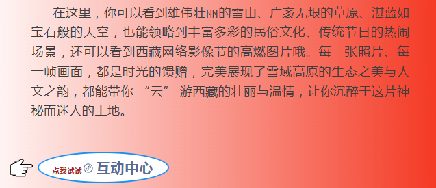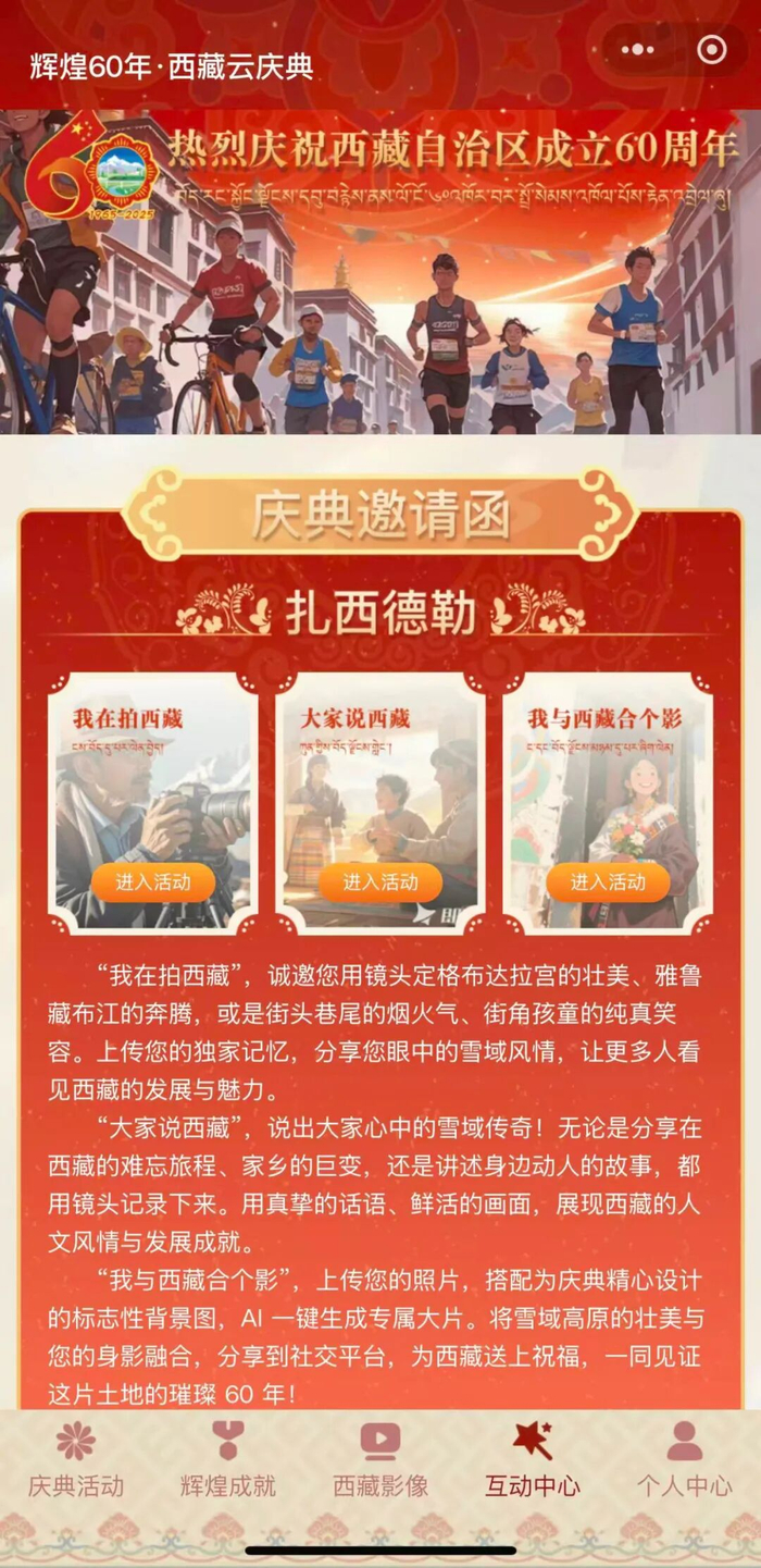 充滿(mǎn)創(chuàng )意的玩法點(diǎn)燃你的參與熱情!在這里,程序你只需上傳自己的照片,就能通過(guò)先進(jìn)的AI技術(shù)生成別具特色的藏式AI大片,體驗一把當 “藏族美女/帥哥” 的感覺(jué)。還能分享你與西藏的故事,無(wú)論是曾經(jīng)的旅行經(jīng)歷,還是對西藏的向往之情,都能在這里與大家交流。同時(shí),為慶典點(diǎn)贊喝彩,讓自己輕松成為西藏大慶的記錄者、傳播者和見(jiàn)證者,在互動(dòng)中加深對西藏的熱愛(ài)。