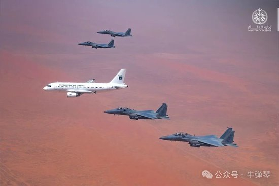 視頻和圖片顯示,夏巴茲專(zhuān)機進(jìn)入沙特領(lǐng)空后,沙特出動(dòng)四架戰機護航。