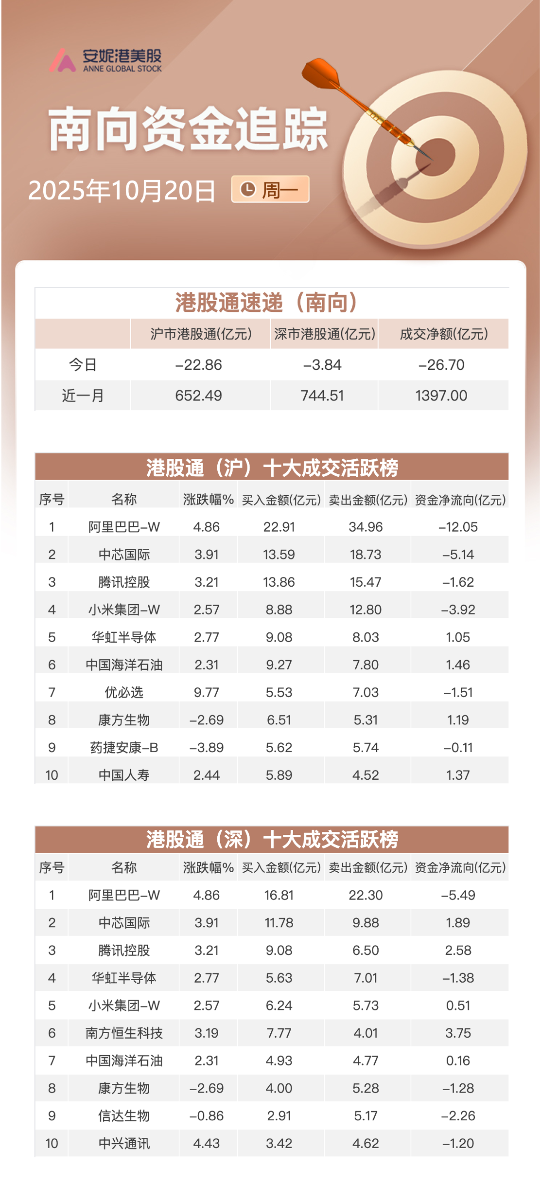大幅凈流出:阿里巴巴-W(09988.HK)17.54億港元;小米集團-W(01810.HK)3.41億港元;中芯國際(00981.HK)3.25億港元;信達生物(01801.HK)2.26億港元。億港元拋