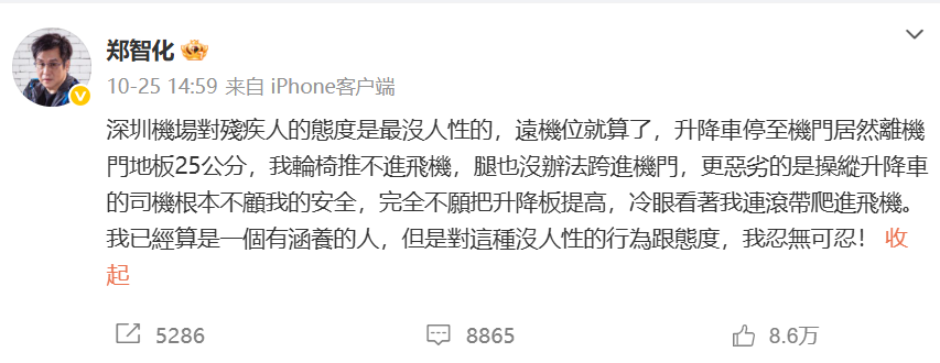 最初,鄭智化反映的問(wèn)題應該是,“升降車(chē)停至機門(mén)居然離機門(mén)地板25公分,我輪椅推不進(jìn)飛機,腿也沒(méi)辦法跨進(jìn)機門(mén),更惡劣的是操縱升降車(chē)的司機根本不顧我的安全?!保ㄠ嵵腔⒉?/p>