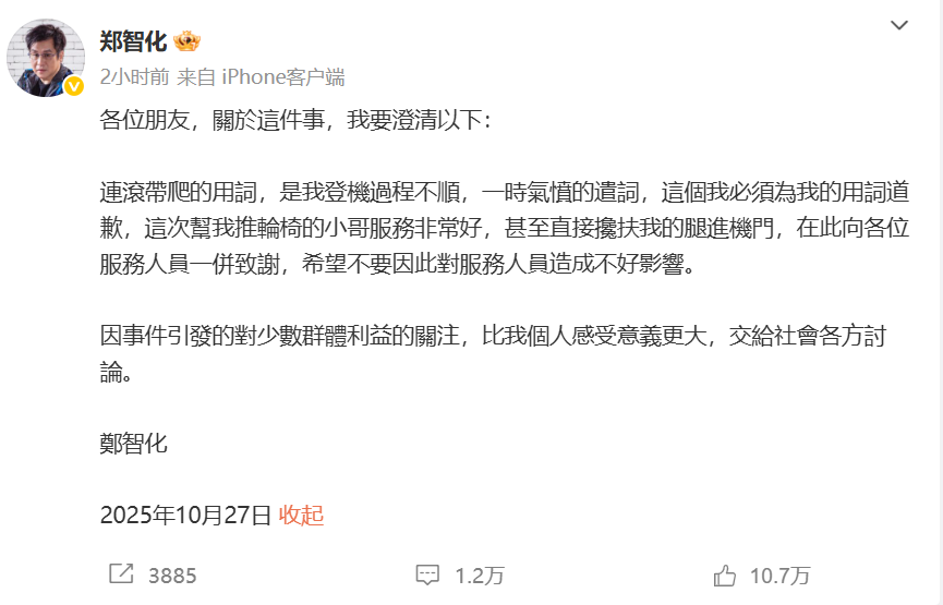 最初,鄭智化對深圳機場(chǎng)的體驗提出批評,但是,他在微博中使用了“連滾帶爬”、“沒(méi)有人性”等情感強烈之詞,加上深圳機場(chǎng)放出了事發(fā)時(shí)為他力盡所能服務(wù)的視頻,他的發(fā)言引來(lái)眾多網(wǎng)友的憤怒。今天下午,他道歉了。