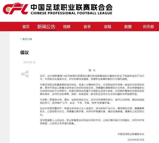 在此中足聯(lián)鄭重呼吁:希望全體球迷以主人翁姿態(tài),堅決抵制不當行為,秉持理性態(tài)度,尊重賽事各方,以團結取代對立,用尊重化解矛盾,共同守護聯(lián)賽形象,建設充滿(mǎn)激情、健康向上的足球文化。
