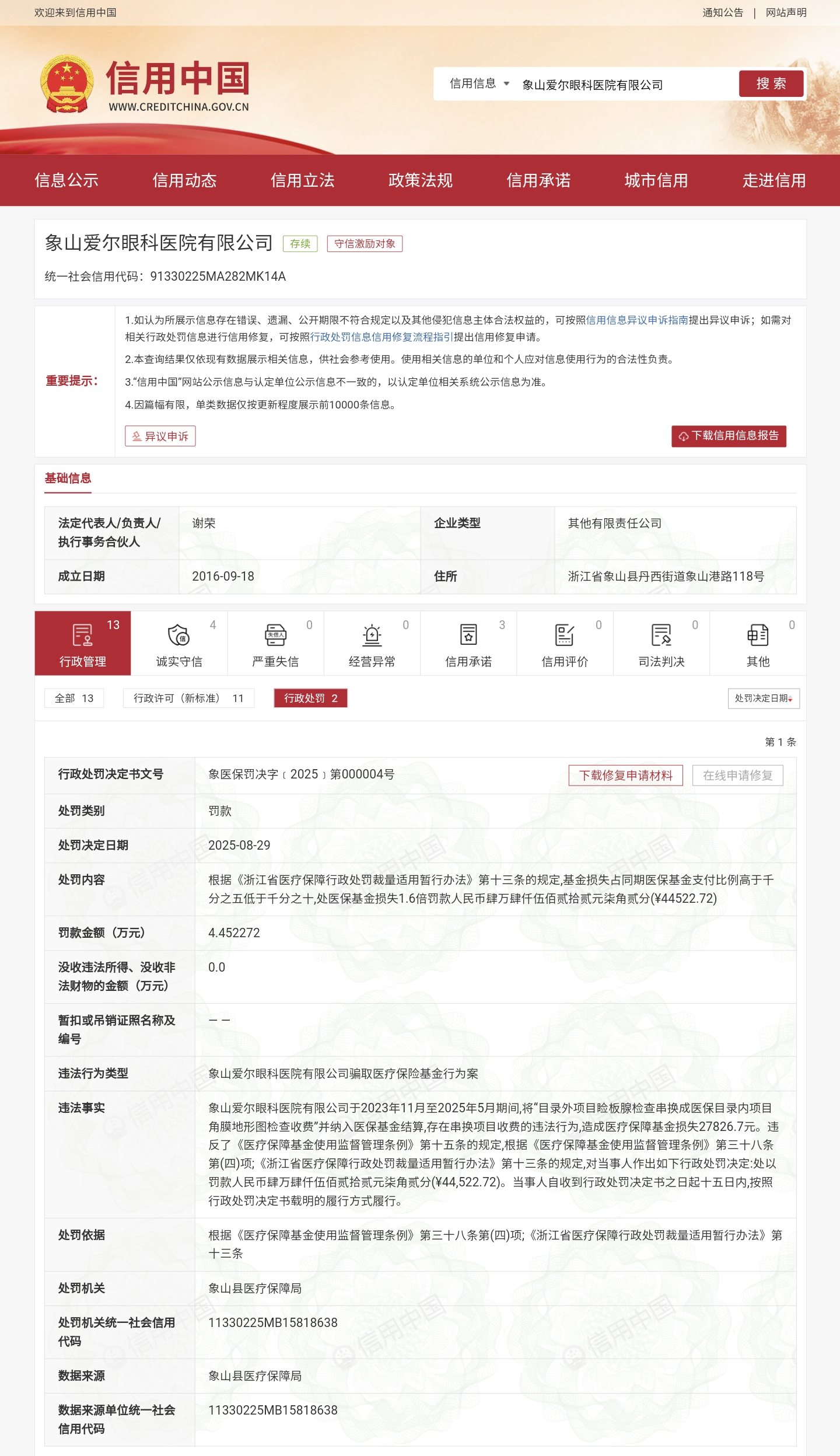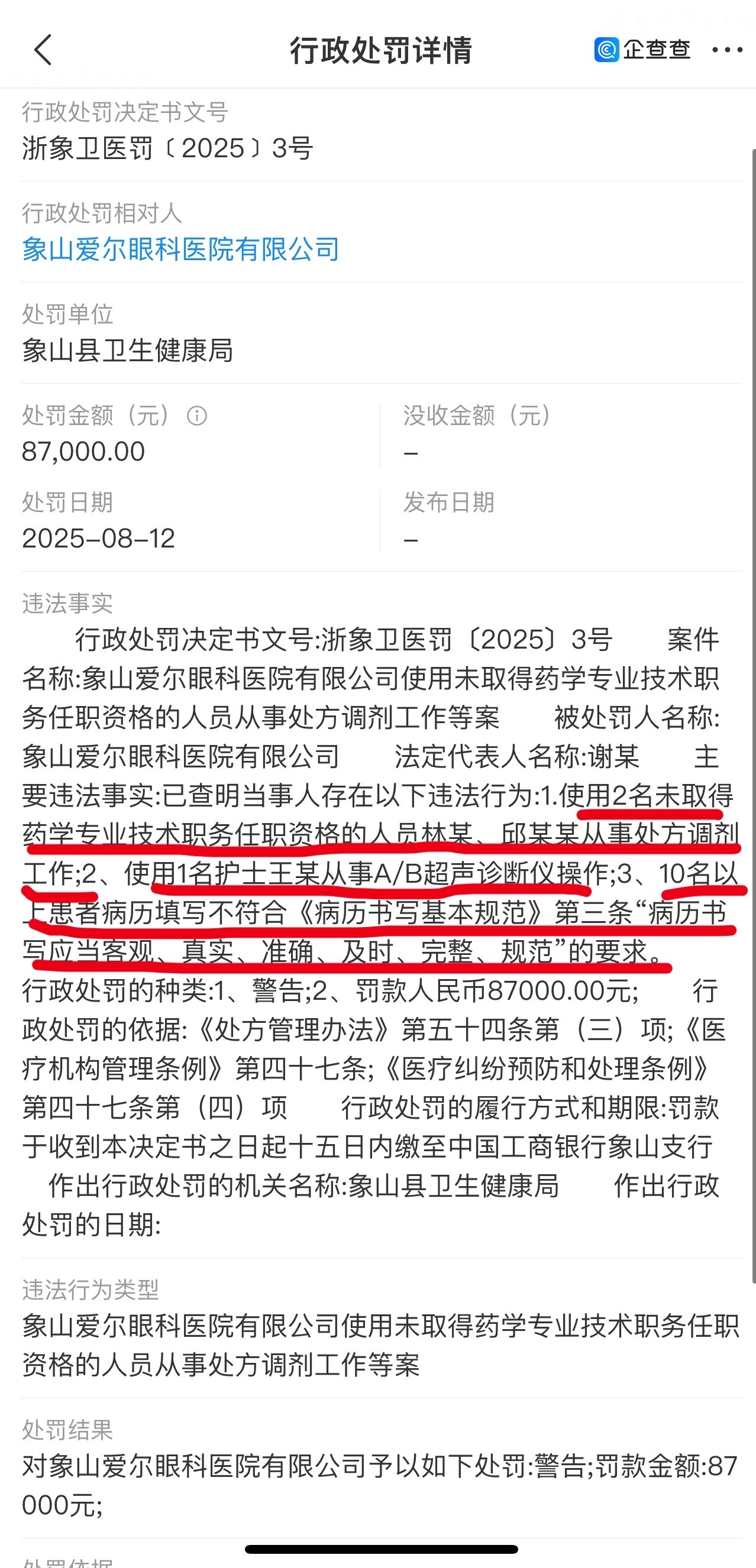 記者獲取的象山縣醫療保障局行政處罰信息中,明確象山愛(ài)爾眼科醫院有限公司存在騙取醫療保險基金行為,對醫院作出罰款44522.72的處罰決定。同時(shí),該醫院因使用未取得藥學(xué)專(zhuān)業(yè)技術(shù)職務(wù)任職資格的人員從事處方調劑工作等違規行為,被象山縣衛生健康局罰款87000元。