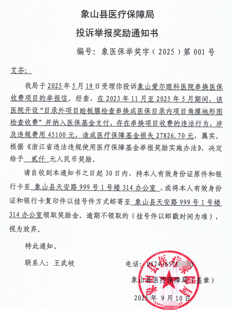 《象山縣醫療保障局投訴舉報獎勵通知書(shū)》顯示,該局于2025年5月19日受理艾芬投訴象山愛(ài)爾眼科醫院串換醫保收費項目的舉報信。經(jīng)查,在2023年11月至2025年5月期間,該醫院開(kāi)設“目錄外項目瞼板腺檢查串換成醫保目錄內項目角膜地形圖檢查收費”并納入醫?;鹬Ц?,存在串換項目收費的違法行為,涉及違規費用45100元,造成醫療保障基金損失27826.70元,屬實(shí)。根據浙江省相關(guān)辦法,決定給予2000元人民幣獎勵。