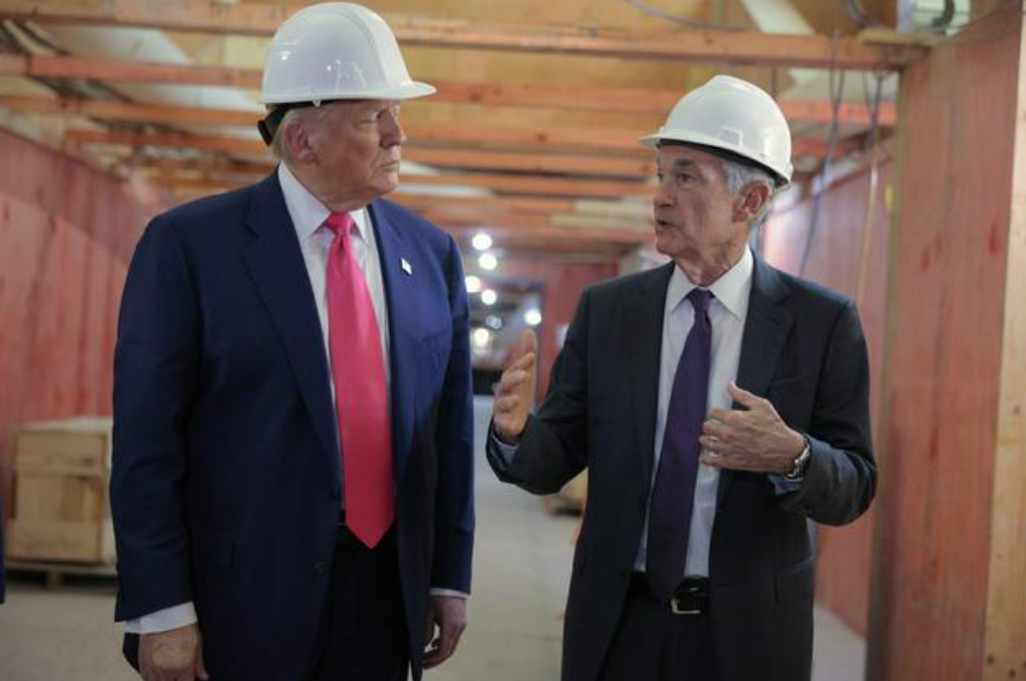 7月24日,特朗普實(shí)地考察了美聯(lián)儲的翻修項目,他和鮑威爾頭戴安全帽,神情嚴肅地站在施工現場(chǎng)。