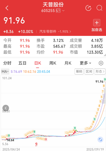 同花順iFind數據顯示,截至9月19日收盤(pán),天普股份報91.96元/股,市值約123億元,年內累計漲幅高達639%,位列A股年內漲幅榜第4名,僅次于上緯新材(1275%)、*ST宇順(987%)、勝宏科技(658%)。