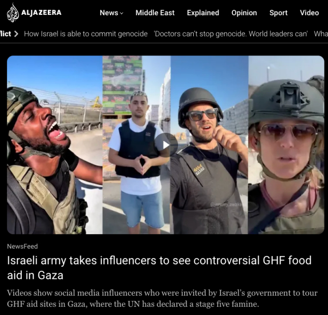 然而,這些“真相之旅”的真相是,網(wǎng)紅們幾乎從未被帶往約旦河西岸,去見(jiàn)證巴勒斯坦人日常面臨的軍事占領(lǐng)和定居者暴力;他們也無(wú)法進(jìn)入加沙,去直面以色列軍事行動(dòng)造成的人道災難。這種將個(gè)人影響力武器化、將情感共鳴商業(yè)化的做法,模糊了真實(shí)見(jiàn)聞與精心策劃的界限,將認知戰場(chǎng)延伸到了每一個(gè)粉絲的手機屏幕上。