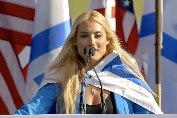 網(wǎng)紅蒙大拿·塔克(Montana Tucker)在2023年11月14日于華盛頓特區舉行的“以色列游行”集會(huì )上向約20萬(wàn)人發(fā)表講話(huà)