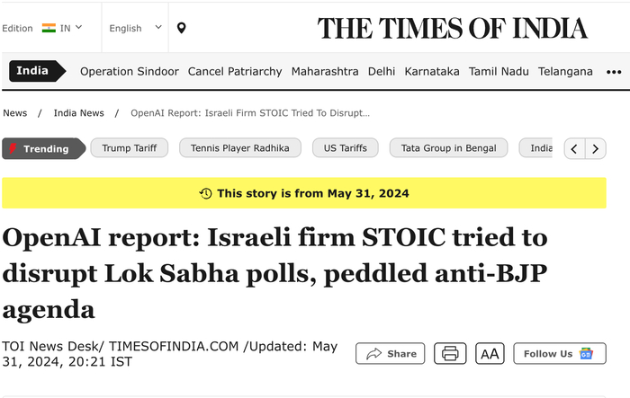 一項調查顯示,一家以色列公司STOIC試圖通過(guò)兜售反印度人民黨的議程,來(lái)干預最近在印度舉行的下議院選舉