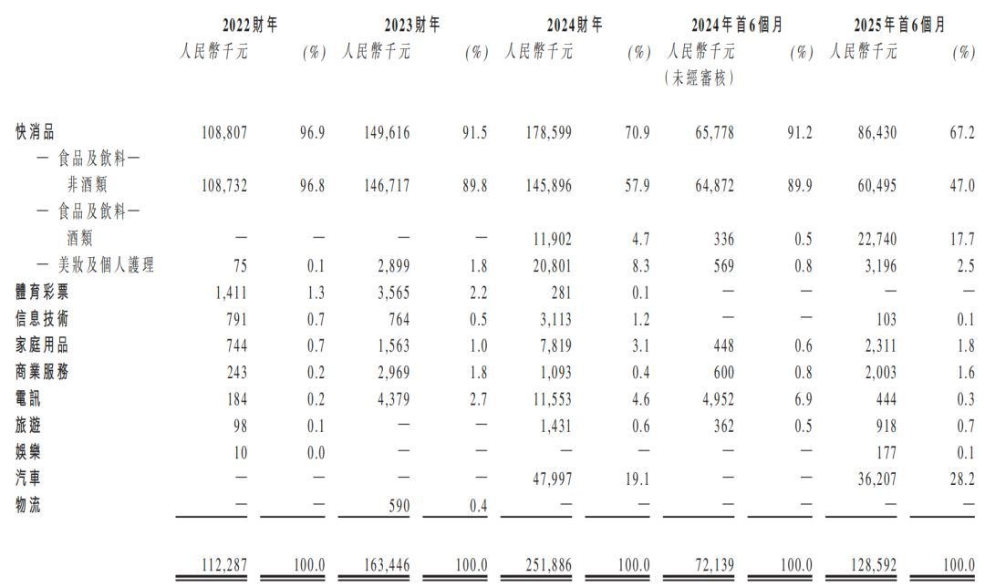 按行業(yè)劃分,其來(lái)自快消品行業(yè)的收入金額增長(cháng),但貢獻占比下降。各期圣火科技分別有96.9%、91.5、70.9%、67.2%的收入來(lái)自快消品行業(yè)。