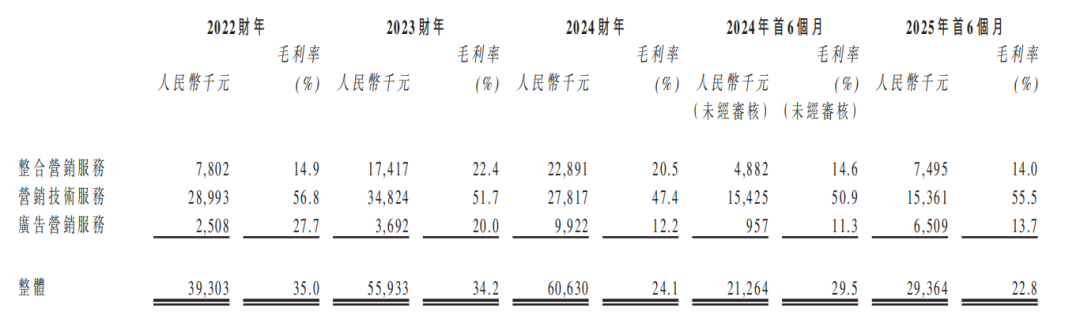 分業(yè)務(wù)來(lái)說(shuō),2022年和2023年,其收入中有9成以上來(lái)自整合營(yíng)銷(xiāo)服務(wù)和營(yíng)銷(xiāo)技術(shù)服務(wù),2024年開(kāi)始,來(lái)自廣告營(yíng)銷(xiāo)服務(wù)的收入占比快速增長(cháng),貢獻近三分之一收入,2025年上半年,該板塊業(yè)務(wù)收入貢獻占比同比增加25.2個(gè)百分點(diǎn)。
