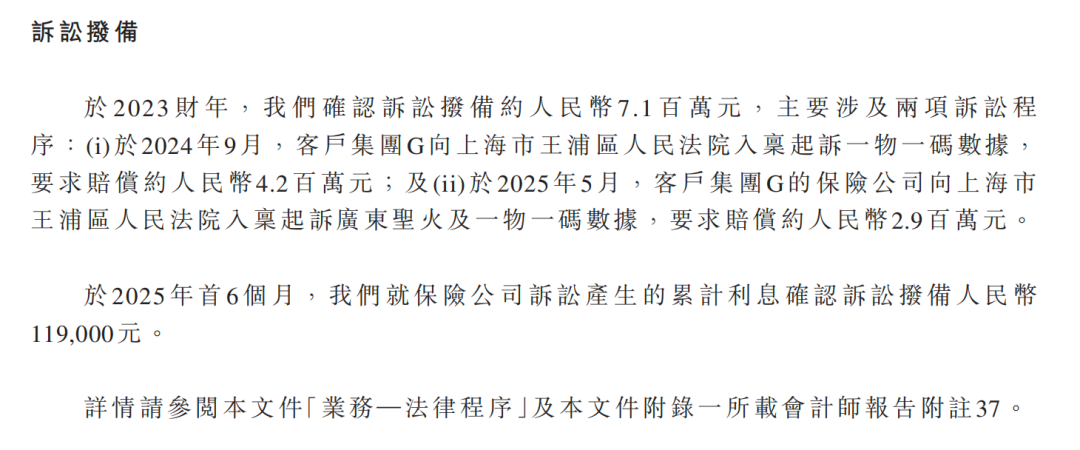 此外,一家保險公司取得代位權后透過(guò)同一法院對一物一碼數據及廣東圣火提出訴訟,索賠約300萬(wàn)元(包括賠償及利息)。2023年,圣火科技因此發(fā)生710.8萬(wàn)元訴訟撥備。