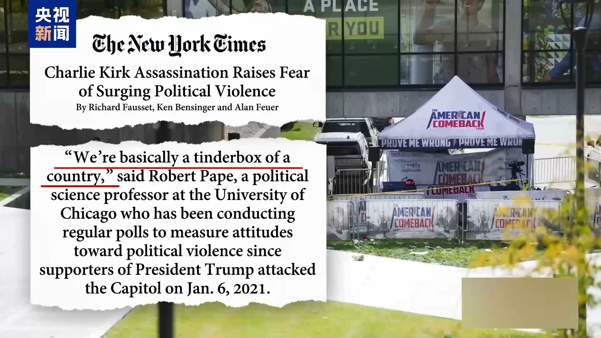 多家媒體發(fā)文指出,柯克遇襲身亡表明政治暴力在美國變得愈發(fā)普遍。而柯克之死又可能會(huì )讓美國本已存在的分裂進(jìn)一步激化,引發(fā)更多政治暴力事件。美國似乎已經(jīng)陷入一種“死循環(huán)”。