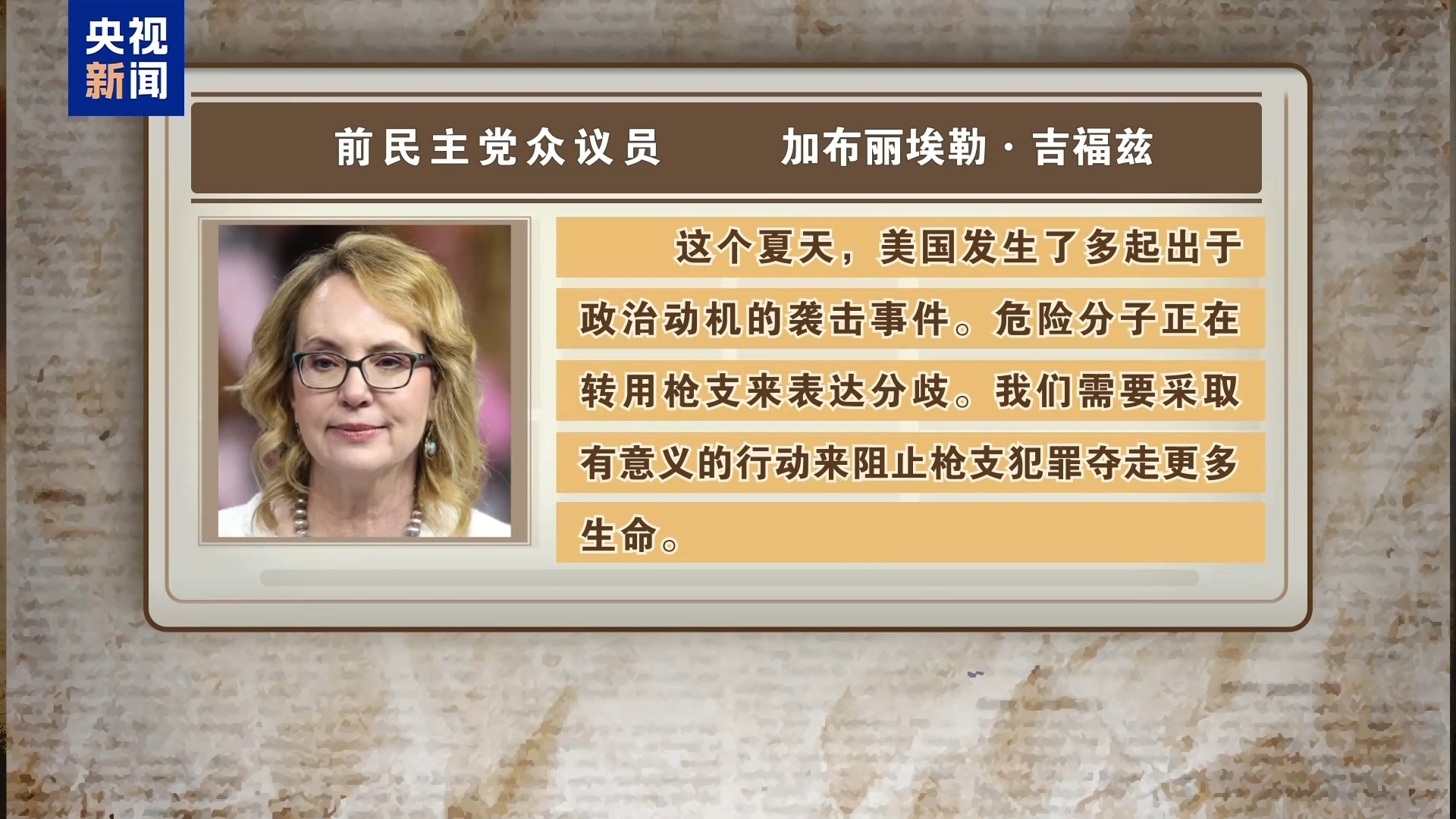 面對頻發(fā)的政治暴力事件,很多美國人都在呼吁社會(huì )各界保持克制。曾遭到過(guò)槍擊的前民主黨眾議員加布麗埃勒·吉福茲說(shuō):“這個(gè)夏天,美國發(fā)生了多起出于政治動(dòng)機的襲擊事件。危險分子正在轉用槍支來(lái)表達分歧。我們需要采取有意義的行動(dòng)來(lái)阻止槍支犯罪奪走更多生命?!?/p>