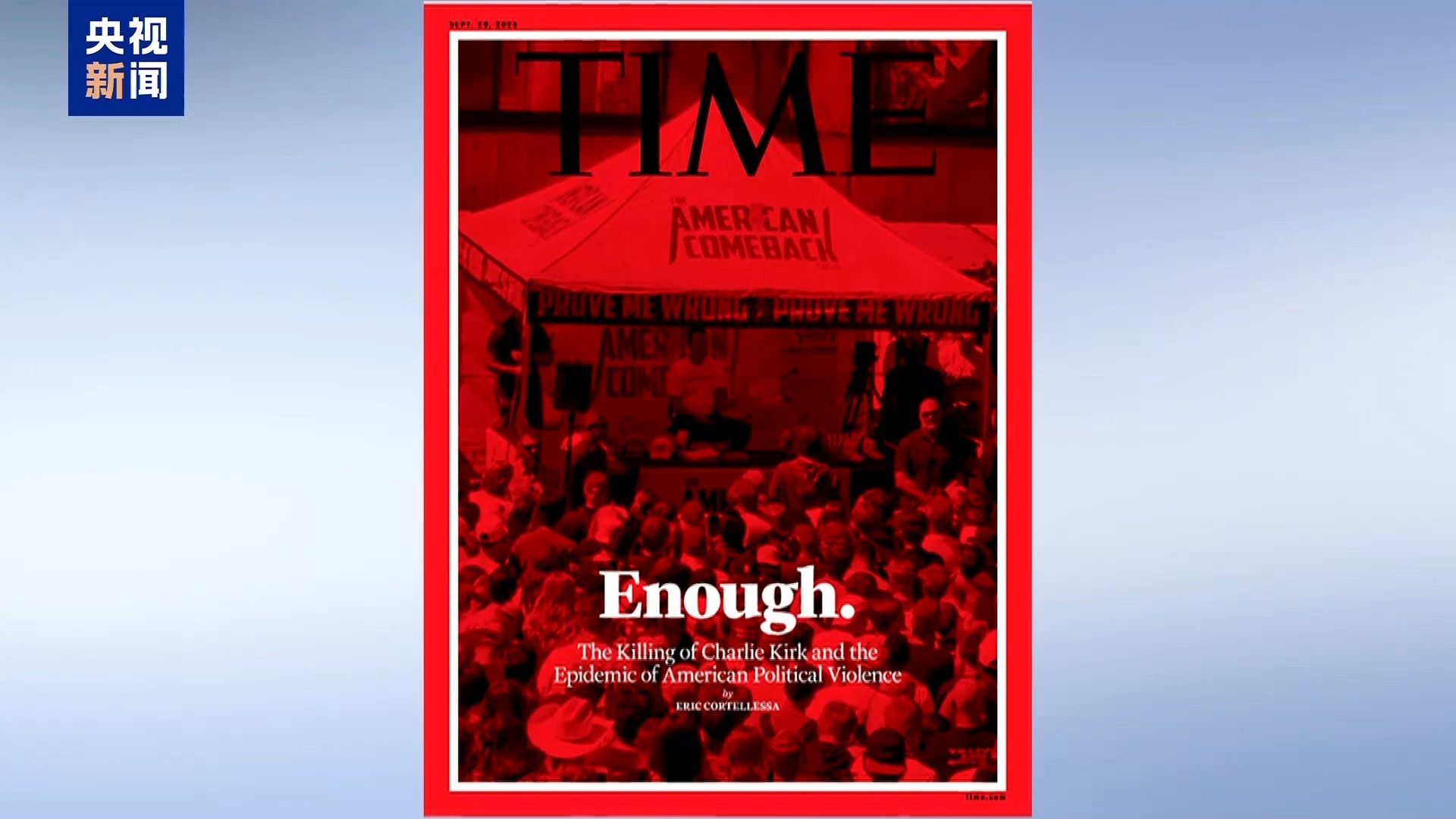 在美國《時(shí)代》雜志即將出版的最新一期封面上,查理·柯克遇襲身亡的現場(chǎng)被配上了“血色”濾鏡。封面上寫(xiě)著(zhù)一個(gè)大大的單詞——“夠了”。
