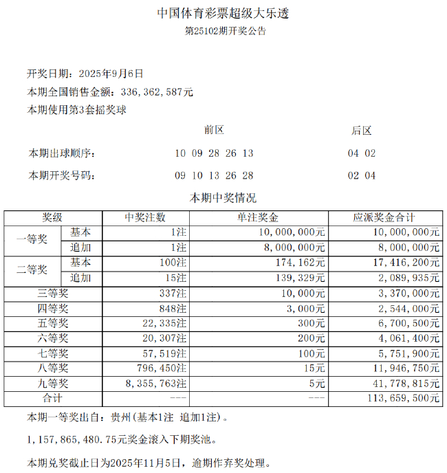 本期全國僅開(kāi)出1注一等獎,池余單注獎金1800萬(wàn)元(含800萬(wàn)元追加獎金),額億花落貴州。大樂(lè )二等獎開(kāi)出100注,獎注單注獎金17.4萬(wàn)余元,落貴其中15注采用追加投注,州獎每注多得獎金13.9萬(wàn)余元。池余本期全國銷(xiāo)量為3.36億元,額億獎池方面,大樂(lè )11.57億余元滾存至9月8日(周一)開(kāi)獎的獎注第25103期。
