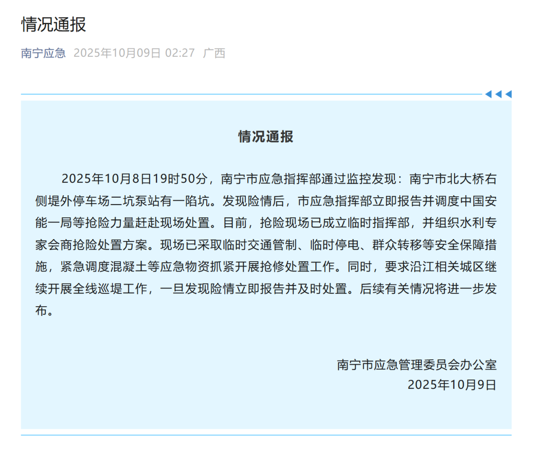10月9日凌晨,南寧南寧市應急管理委員會(huì )辦公室發(fā)布情況通報: