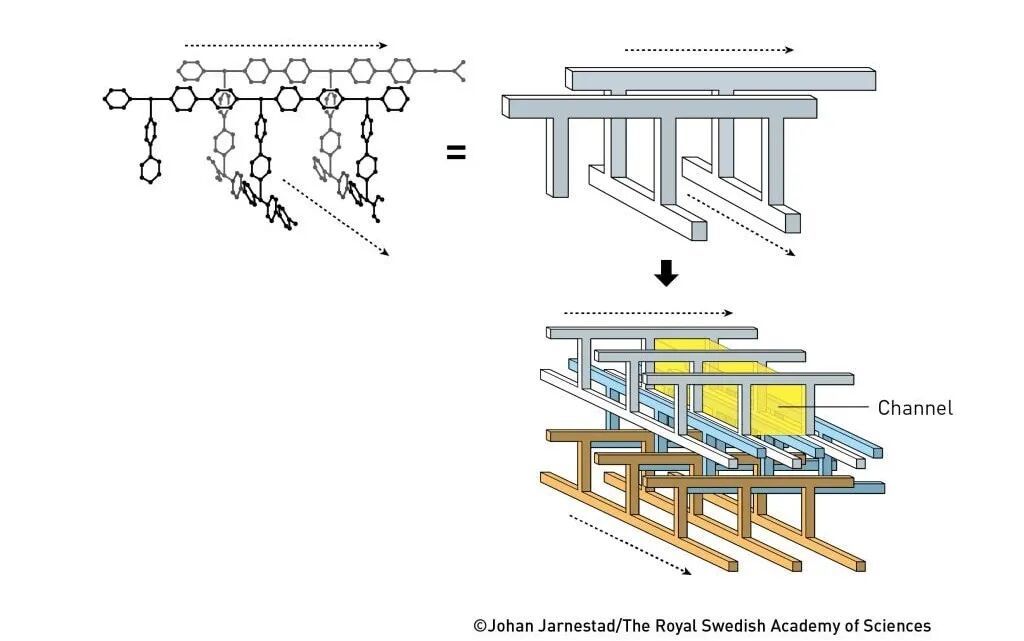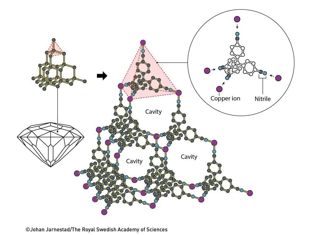 直到十多年后,他終于動(dòng)手驗證這一想法。羅布森將帶正電的銅離子與四臂分子相結合,結果這些分子像鉆石晶格一樣自組裝成規則的三維晶體結構,不同的是,這種晶體內部竟有大量空腔。1989年,他在《美國化學(xué)會(huì )志》上發(fā)表成果,首次提出這類(lèi)分子網(wǎng)絡(luò )的潛力,預言它們將賦予材料前所未有的性質(zhì)。