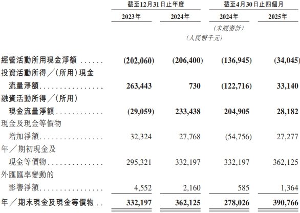 截至2023年及2024年12月31日止年度以及截至2025年4月30日止四個(gè)月,勁方醫藥經(jīng)營(yíng)活動(dòng)所用現金凈額為人民幣202.1百萬(wàn)元、人民幣206.4百萬(wàn)元及人民幣34.0百萬(wàn)元。