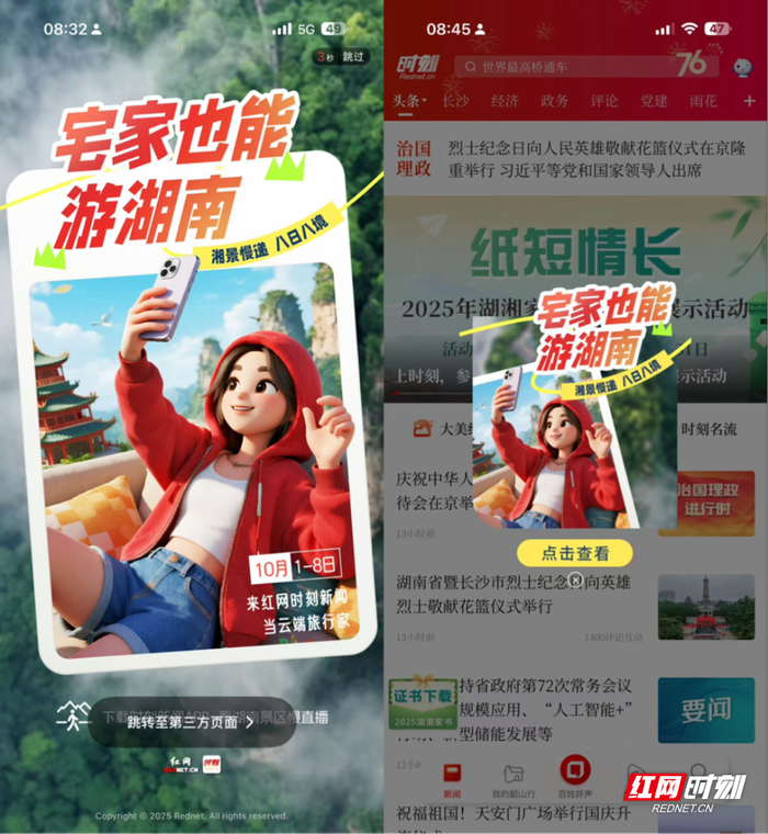 本次活動(dòng),紅網(wǎng)啟動(dòng)了全方位的宣傳矩陣。從時(shí)刻新聞客戶(hù)端開(kāi)機頁(yè)的強勢預告,到彈窗推送的精準提醒,再到頭條區的持續聚焦,紅網(wǎng)通過(guò)核心流量位進(jìn)行多頻次、強曝光引流,確保每一位用戶(hù)都能輕松開(kāi)啟這場(chǎng)“說(shuō)走就走”的云端之旅。