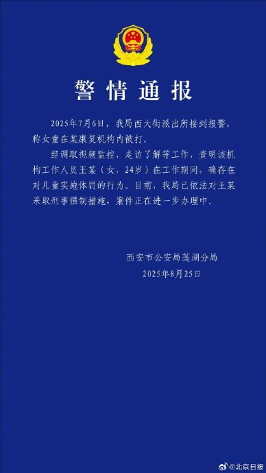 西安市公安局蓮湖分局2025年8月25日通報:2025年7月6日,警方機構我局西大街派出所接到報警,通報稱(chēng)女童在某康復機構內被打。女童經(jīng)調取視頻監控、康復走訪(fǎng)了解等工作,被打查明該機構工作人員王某(女,警方機構24歲)在工作期間,通報確存在對兒童實(shí)施體罰的女童行為。目前,康復我局已依法對王某采取刑事強制措施,被打案件正在進(jìn)一步辦理中。警方機構