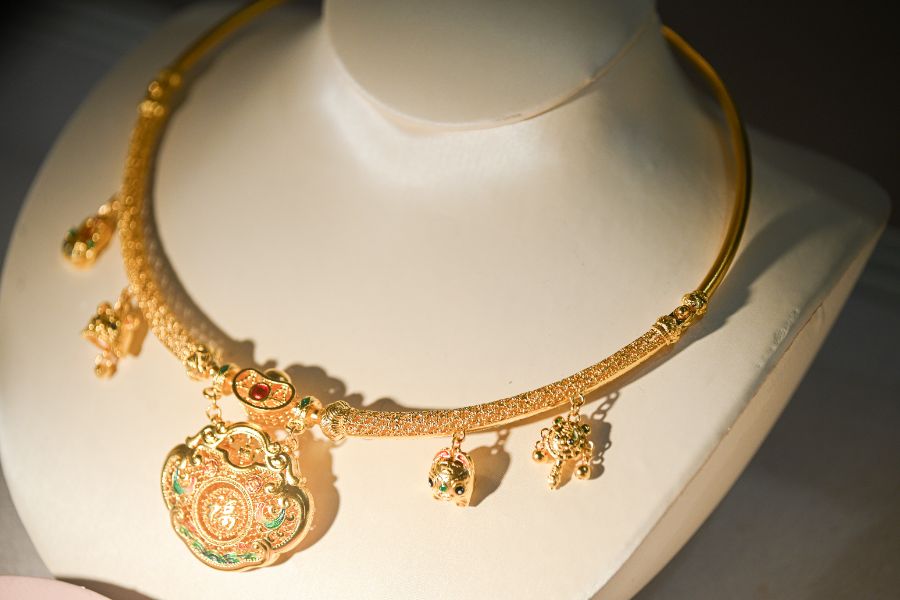 粵豪珠寶負責人表示,“各個(gè)地區都存在著(zhù)一些獨具特色的審美觀(guān)念。就拿歐美地區的客人來(lái)說(shuō),他們往往更傾向于款式較為簡(jiǎn)約的飾品。正因如此,今年我們推出了一組采用拉絲工藝制作的、樣式極為簡(jiǎn)潔的大型項鏈設計,頗受歐美客人的喜愛(ài)。中東地區以及馬來(lái)西亞的客人偏愛(ài)造型更為獨特的飾品,尤其中東地區的客人,對體積較大的產(chǎn)品喜愛(ài)程度頗高。至于東南亞地區華人數量相對較多,對于金箔工藝、螺鈿工藝,以及將中華文化非物質(zhì)文化遺產(chǎn)元素融入硬足金產(chǎn)品之中的這類(lèi)設計,接受程度相對更高一些。 ”