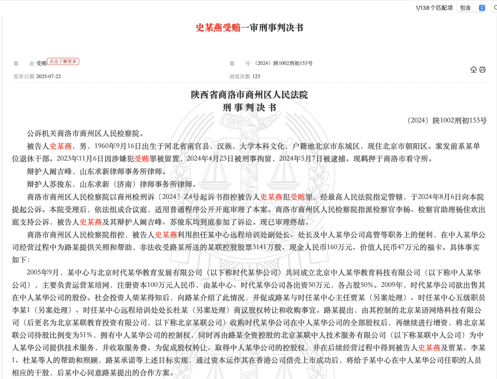 判決書(shū)顯示,部行2005年9月,某中心與北京時(shí)代某華教育發(fā)展有限公司(以下稱(chēng)時(shí)代某華公司)共同成立北京中人某華教育科技有限公司(以下稱(chēng)中人某華公司),主要負責運營(yíng)某培網(wǎng),注冊資本100萬(wàn)元人民幣,各占股50%。2009年,時(shí)代某華公司欲出售其在中人某華公司的股份。路某獲悉后,由其控制的北京某語(yǔ)網(wǎng)絡(luò )科技有限公司(后更名為北京某聯(lián)教育投資有限公司,以下稱(chēng)北京某聯(lián)公司)收購時(shí)代某華公司在中人某華公司的全部股權后,再繼續進(jìn)行增資,將北京某聯(lián)公司持股比例變?yōu)?1%……為促成股權轉讓、取得中人某華公司的控股權,并在后續經(jīng)營(yíng)過(guò)程中得到被告人史某燕等人的幫助和照顧,路某承諾等上述目標實(shí)現,通過(guò)資本運作其在香港公司借殼上市成功后,將給予某中心在中人某華公司任職的人員相應的干股。