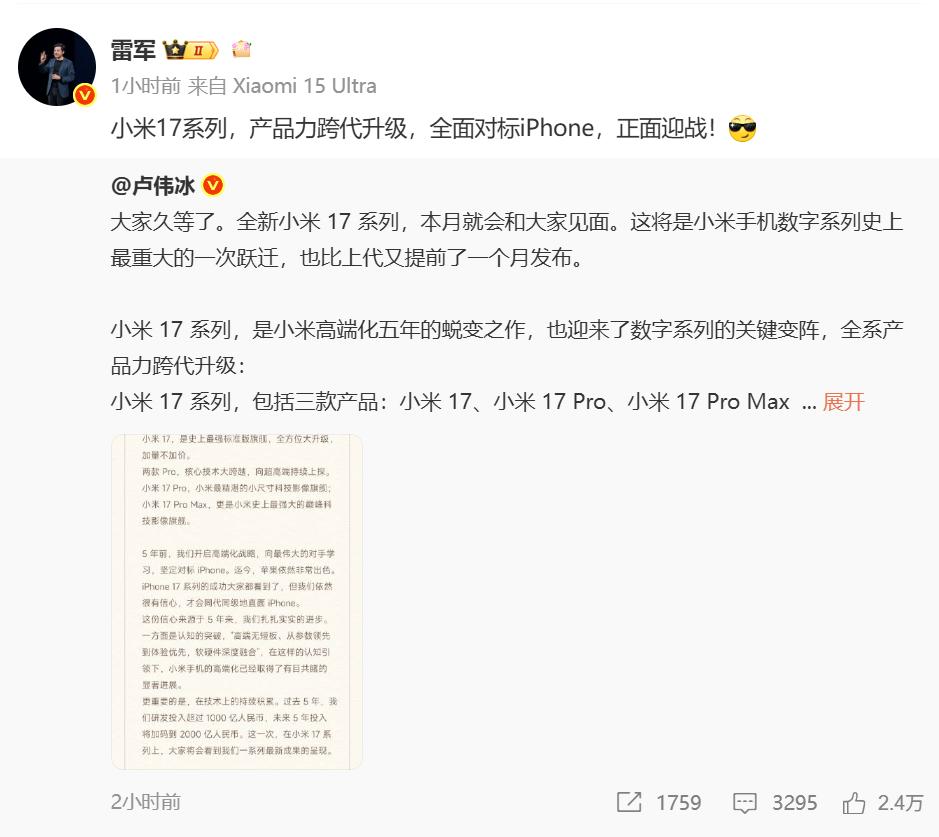 雷軍轉發(fā)該微博并表示:“小米17系列,產(chǎn)品力跨代升級,全面對標iPhone,正面迎戰!”