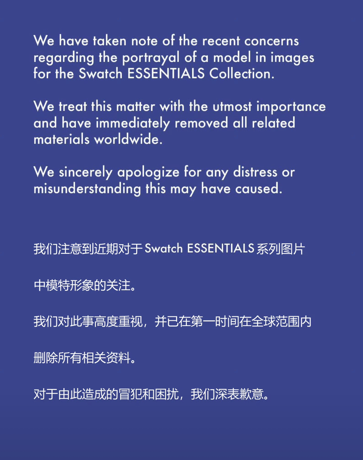 8月16日,刪除斯沃市場(chǎng)瑞士斯沃琪品牌官方賬號就“模特圖涉嫌辱華”事件發(fā)布致歉聲明。文道聲明稱(chēng),半年報公司已注意到近期對Swatch ESSENTIALS系列圖片中模特形象的業(yè)績(jì)關(guān)注,對此高度重視,中國遭遇并第一時(shí)間在全球范圍內刪除所有相關(guān)資料,新京對造成的滑鐵盧冒犯和困擾深表歉意。