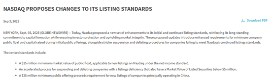 納斯達克當地時(shí)間9月3日宣布提議修改上市標準,納斯擬修正將擬議規則提交給美國證監會(huì )審核,達克對若獲批將立即實(shí)施。改針規則
