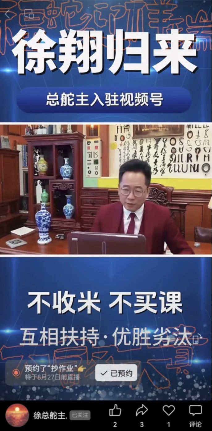 該視頻配文也非常簡(jiǎn)單,“徐翔歸來(lái) 總舵主入駐視頻號”,并表示,“不收米 不買(mǎi)課 相互扶持、優(yōu)勝劣汰”。但是在左下角透露了8月27日將進(jìn)行“抄作業(yè)”的直播,在業(yè)內看來(lái),“抄作業(yè)”明顯是為了規避平臺監管敏感詞,從總舵主、徐翔等關(guān)鍵詞,卻能引發(fā)觀(guān)眾“抄作業(yè)”等于推薦徐翔買(mǎi)入股票的聯(lián)想。
