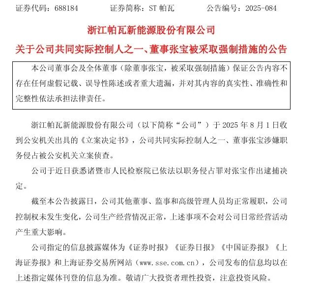 實(shí)控人曾占用公司資金1.9億元8月3日晚間,ST帕瓦披露《關(guān)于公司共同實(shí)際控制人之一、董事張寶被立案偵查的公告》顯示,公司于2025年8月1日收到公安機關(guān)出具的《立案決定書(shū)》,公司共同實(shí)際控制人之一、