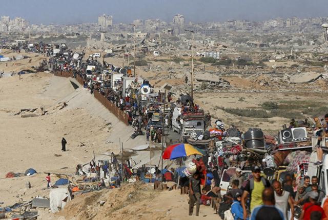 當地時(shí)間2025年9月16日,加沙地帶中部努賽賴(lài)特難民營(yíng)地區,流離失所的巴勒斯坦民眾在以色列再次發(fā)布加沙城撤離令后,帶著(zhù)隨身物品向南遷移。視覺(jué)中國 圖