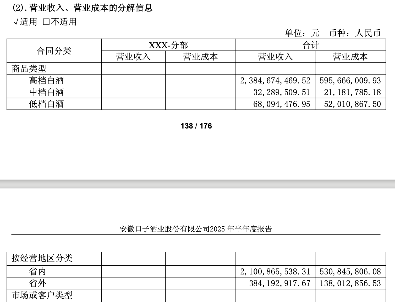 具體來(lái)看,口子窖高檔白酒營(yíng)收為23.85億元,同比下滑19.8%;中、低檔白酒收入降幅相對較小,分別同比下滑10.82%、2.59%,營(yíng)業(yè)成本均大于營(yíng)業(yè)收入,陷入越賣(mài)越虧的泥潭;省內和省外營(yíng)收同比下滑分別為19.31%、19.24%。