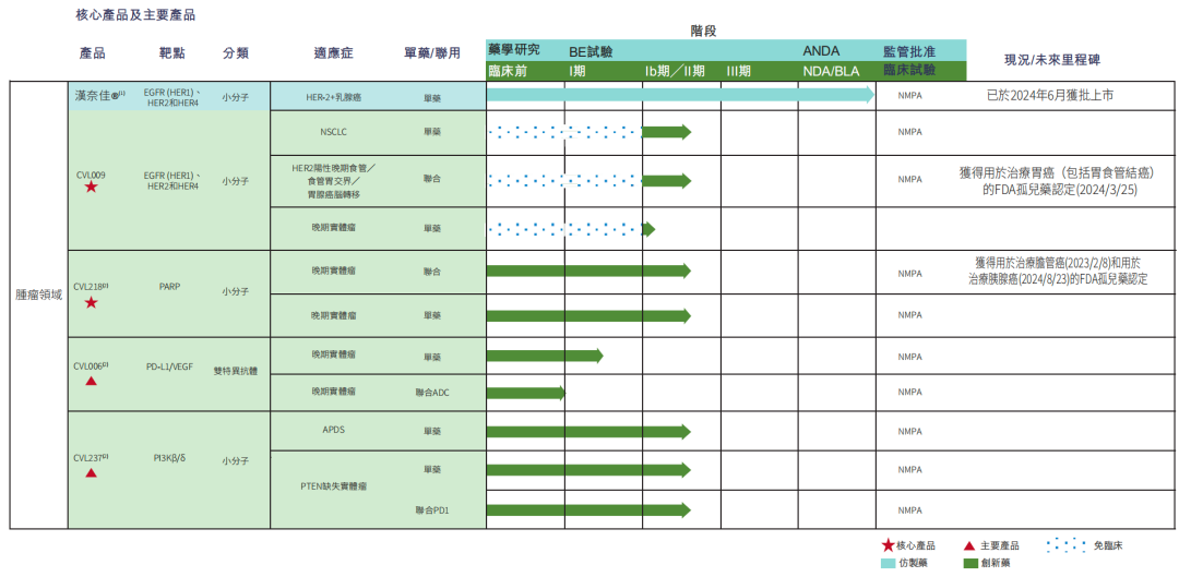 CVL218則是一款引進(jìn)授權的新型第二代高選擇性PARP抑制劑,亦稱(chēng)為美呋哌瑞,適用于治療三陰性乳腺癌、膽管癌及胰腺癌等晚期實(shí)體瘤,于2024年8月獲得治療胰腺癌的孤兒藥資格,目前已進(jìn)入實(shí)體瘤適應癥的II期臨床試驗。