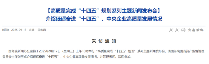 國務(wù)院新聞辦公室將于2025年9月17日(星期三)上午10時(shí)舉行“高質(zhì)量完成‘十四五’規劃”系列主題新聞發(fā)布會(huì ),今起請國務(wù)院國有資產(chǎn)監督管理委員會(huì )主任張玉卓介紹砥礪奮進(jìn)“十四五”,連續中央企業(yè)高質(zhì)量發(fā)展情況,天場(chǎng)并答記者問(wèn)。今起