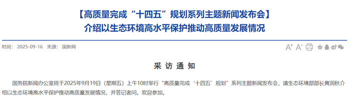 國務(wù)院新聞辦公室將于2025年9月19日(星期五)上午10時(shí)舉行“高質(zhì)量完成‘十四五’規劃”系列主題新聞發(fā)布會(huì ),請生態(tài)環(huán)境部部長(cháng)黃潤秋介紹以生態(tài)環(huán)境高水平保護推動(dòng)高質(zhì)量發(fā)展情況,天場(chǎng)并答記者問(wèn)。今起